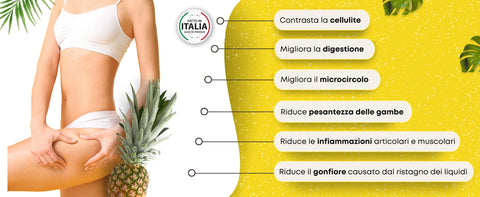 Ingredienti: Bromelina 5000 GDU/g (da Ananas comosus (L.) Merr., gambo); Agenti di carica: fosfato dicalcico, cellulosa, idrossipropilcellulosa; Agenti antiagglomeranti: mono e digliceridi degli acidi grassi, magnesio stearato, biossido di silicio.